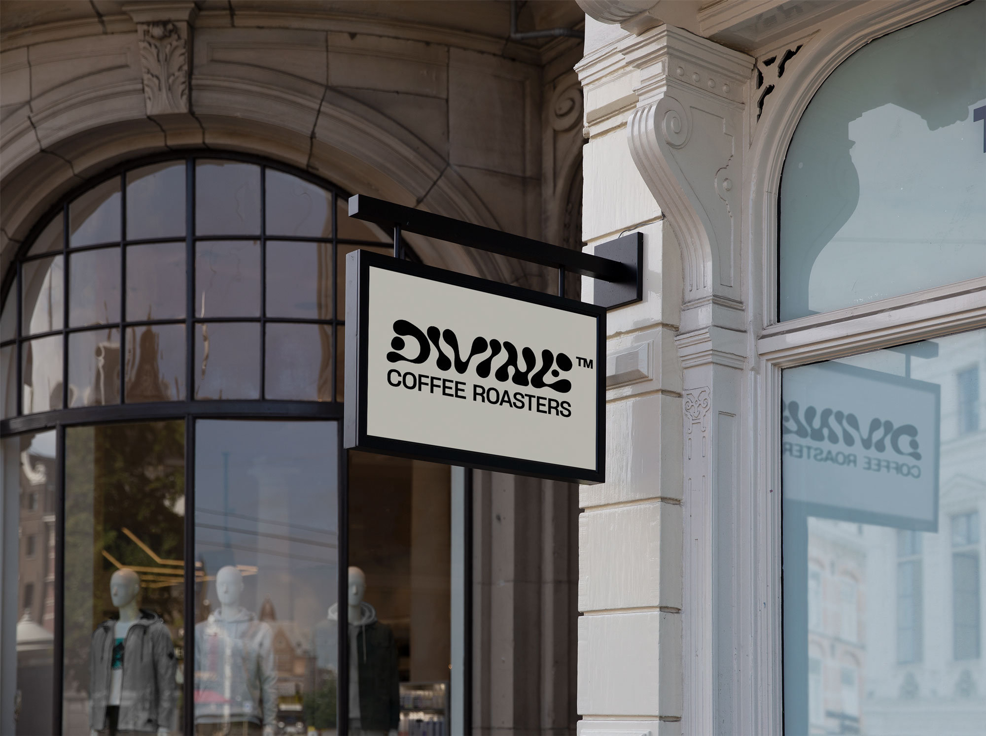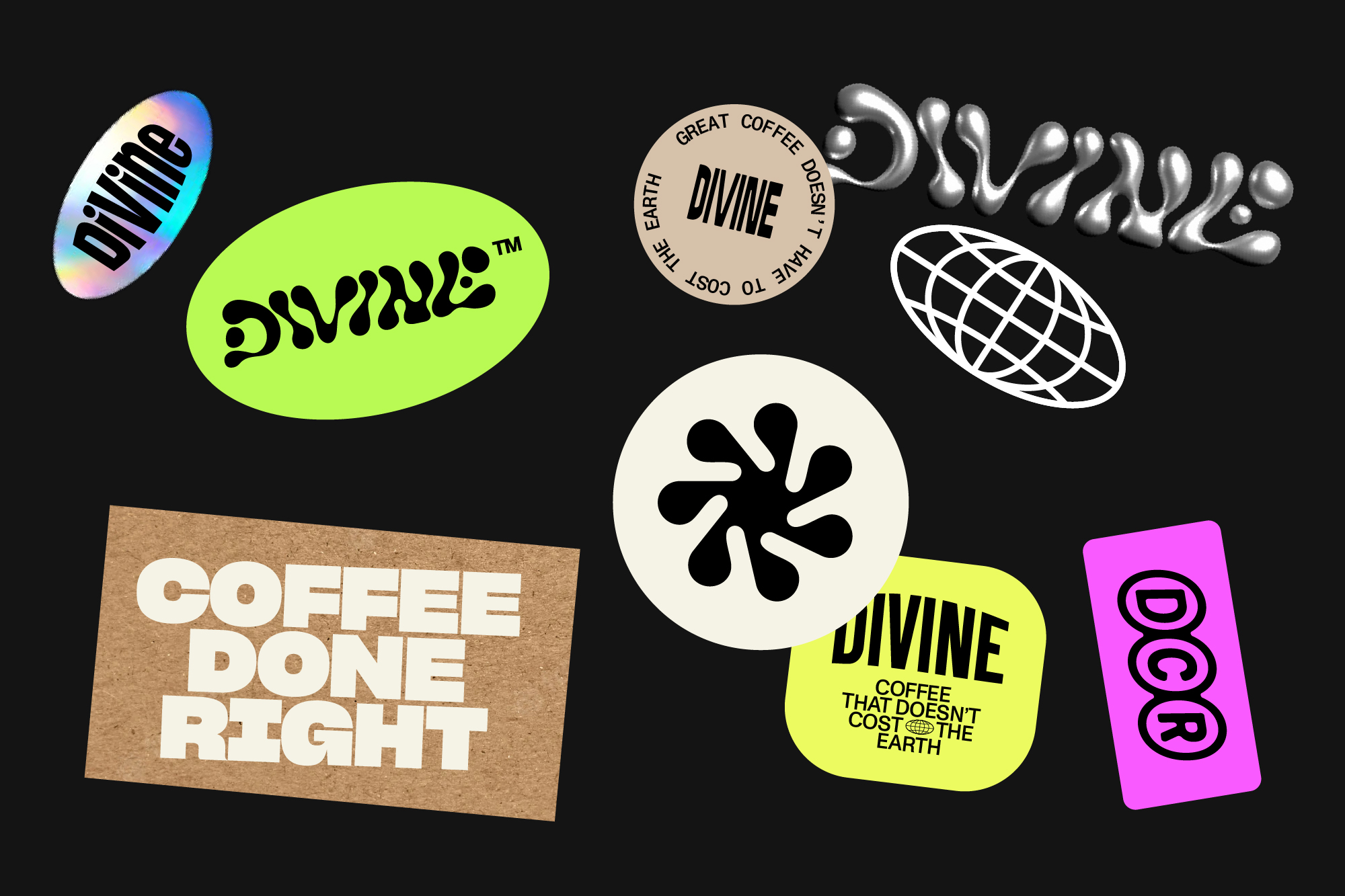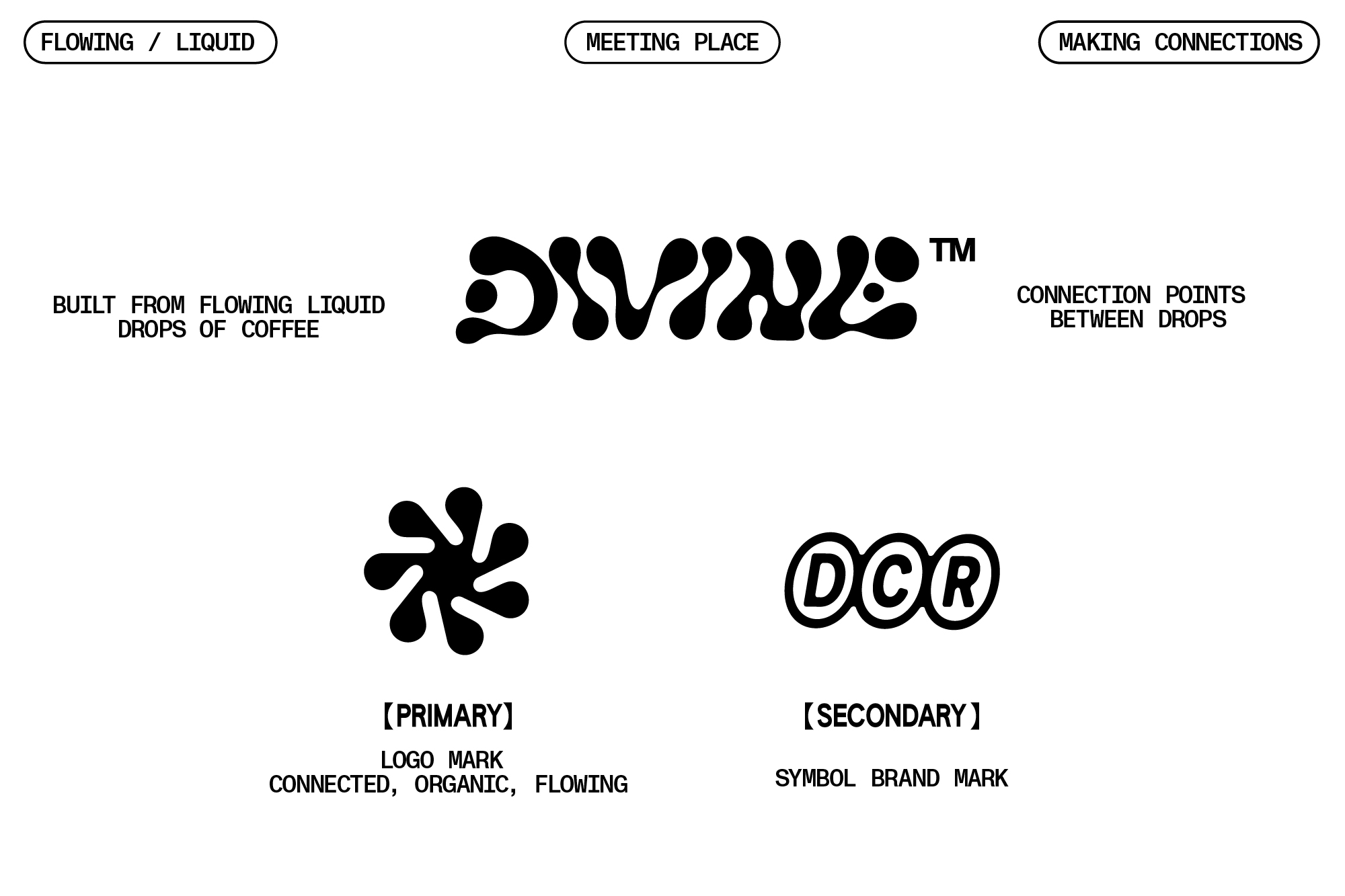 This concept route uses hand-drawn, fluid letterforms to create the logotype as though drawn from drips of coffee. The drips connect together to create a flowing logotype.